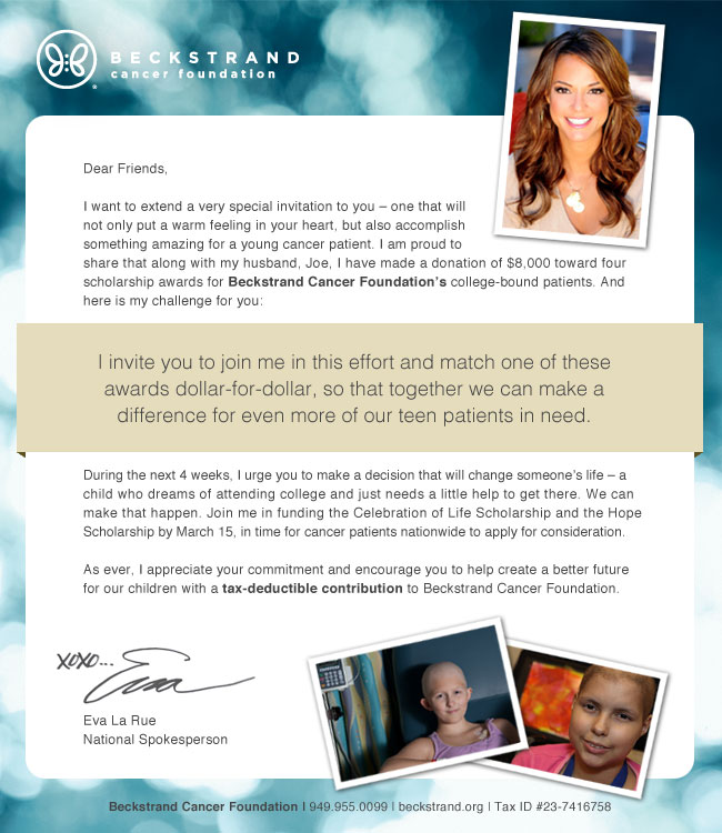 I want to extend a very special invitation to you – one that will not only put a warm feeling in your heart, but also accomplish something amazing for a young cancer patient. I am proud to share that along with my husband, Joe, I have made a donation of $8,000 toward four scholarship awards for Beckstrand Cancer Foundation’s college-bound patients. And here is my challenge for you:
