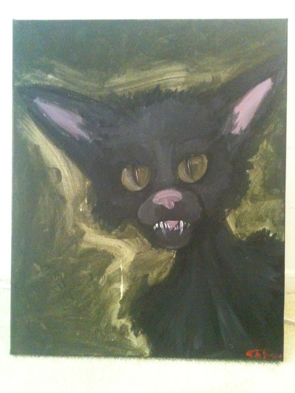 {Since DOG is not an actual cat, and just exists in a painting, I won’t have to worry about him throwing up hairballs on my light colored carpet. Altho I may need a frame since the paint on the canvas goes around the edge and I don’t want it to rub off}